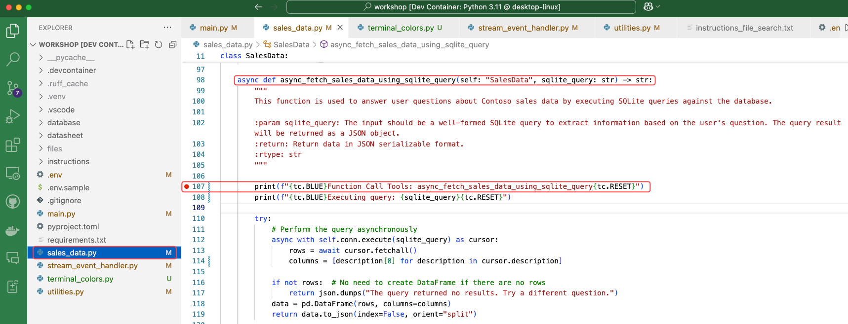 In this lab, you'll enable the function logic to execute dynamic SQL queries against the SQLite database. The function will be called by the LLM to answer user questions about Contoso sales data.
