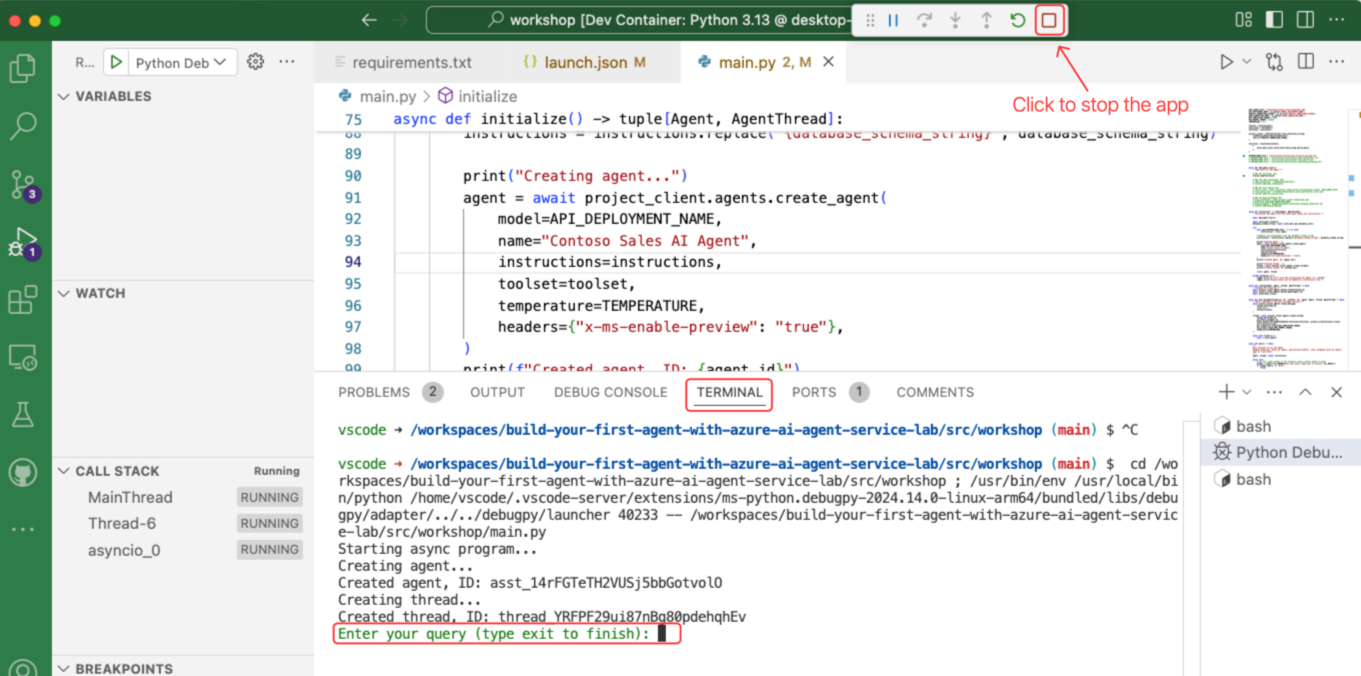 When you're done, type exit, or press Shift+F5 to stop the agent app.